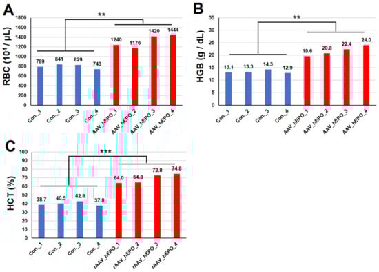 Measurements of the hematopoietic parameters. The bar graphs (A–C) illustrate the values observed for each mouse. The blue bars represent the values observed in the control group (n = 4), while the red bars represent the values observed in the AAV-hEPO group (n = 4). The numbers displayed above each bar indicate the raw values. (A): RBC counts; (B): HGB concentration; (C): HCT percentage. ** p < 0.01; *** p < 0.001.