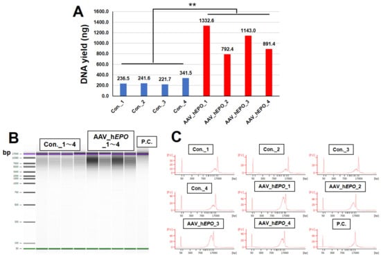Confirmation of DNA yield and fragmentation in DBS-derived DNA. The bar graphs (A) illustrate the values observed for each mouse. The blue bars represent the values observed in the control group (n = 4), while the red bars represent the values observed in the AAV-hEPO group (n = 4). The numbers displayed above each bar indicate the raw values. (A): DNA yield; (B): electrophoresis photographs; (C): histogram of signals acquired via electrophoresis. P.C.: positive control as intact DNA. ** p < 0.01.