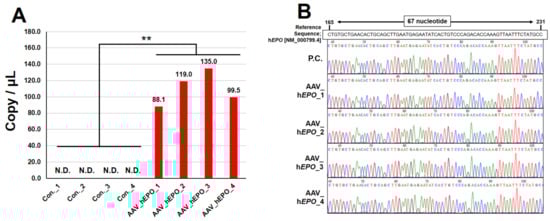 Detection of gene doping and Sanger sequencing. The bar graphs (A) illustrate the values observed for each mouse. The red bars represent the values observed in the AAV-hEPO group (n = 4). The numbers displayed above each bar indicate the raw values. (A): Detection of gene doping via the TaqMan qPCR assay and the quantitative copy number values; (B): Sanger sequencing waveforms and alignment to the reference sequence of the hEPO gene. N.D.: not detected. ** p < 0.01.