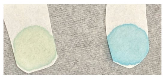 The final optimized formulation for the sensor is seen in Table 4. A sulfonephthalein dye, bromocresol green, was chosen as the colorimetric indicator to detect the presence of a base environment inside a closed container. These dyes are known for their intense colors and widespread use in analytical chemistry [32]. It was hypothesized in the early 1900s that their color-changing mechanism was mainly due to the formation of a resonance stabilized quinone–phenolate ion complex [33]. As bromocresol green dye is deprotonated to form this complex, it can transition from an intense yellow color at low pH to green and then, finally, blue in conditions of higher pH. Figure 2 shows the initial sensor color in green (left) next to a blue sensor (right) exposed to the headspace of an ammonium hydroxide solution. After use, the sensor was found to be able to be restored to its initial green coloring after heating in the oven at 50 °C, indicating its potential for reuse.