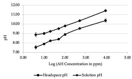 Comparison of pH measurements for NH4OH dilutions in headspace and in solution (n = 4).