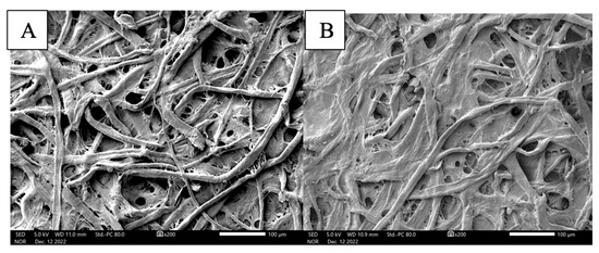 SEM imaging of (A) plain filter paper and (B) bromocresol green sol–gel-coated sensor.