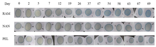 Some widely available hard plastic cases (Ray Allen Manufacturing, Nanuk, and Pelican brands) used for training aid kits were used to test the stability of the sensor over 10 weeks in these containers. As time passed, the sensor color was visually observed to be altered by its surrounding environment in different degrees (Figure 5). Figure 6 shows the relationship between time and the normalized RGB data for a sensor in each case tested. As color changed, the RGB values shifted as well. From the graphs shown in Figure 6, it can be seen that the sensors in the Ray Allen Manufacturing case had the most drastic separation between the RGB values. The increasing separation between the red, blue, and green lines across time corresponded to a change in the overall sensor color. The larger the separation, the more significant the change of color. Visually, the RAM case sensors were seen to begin transitioning from green to blue between 19 and 26 days, indicating a basic environment (Figure 5). The PEL and NAN case sensors did not show as wide a separation for the RGB lines as the RAM case. However, when looking at Figure 5 and Figure 6, it is noted that at approximately 26 days the Pelican case sensors began acquiring a blue ring of color as did the Nanuk case sensors after 30 days. This is suspected to be due to minor contamination from the ambient environment. In general, regardless of the outer blue ring color, they remained dominantly green and, thus, were still functional for detection of NH4OH. One possible explanation for the significant color change in the RAM case is the foam lining contained within the kit. As opposed to the Pelican and Nanuk cases, Ray Allen Manufacturing uses an adhesive to affix the foam to the plastic case. This adhesive may have released VOCs that generated a basic environment within the case, causing the change in color.