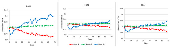 Individual sensor RGB value trends across 10 weeks for each of the cases examined over time (normalized data; n = 3).