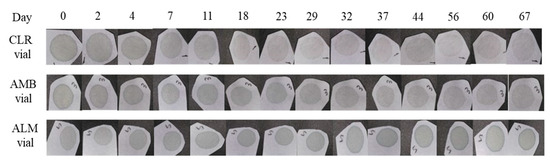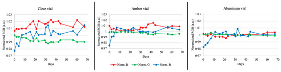 The progression of the sensor colors over a 10-week period is shown in Figure 7 and the graphs in Figure 8 show the degree of separation between the RGB values over time. In this experiment, the sensors in the clear vial (most light) showed the most separation between RGB values, followed by the sensors in the amber vial (less light), indicating that exposure to light caused a substantial change in color. Visually, it was observed that the CLR vial sensors transitioned from their initial green color to a faded gray color occurring at approximately 4–7 days (Figure 7). Meanwhile, the color transition was harder to visually discern for the AMB vial sensors but, according to the data in Figure 8, they appeared to have taken approximately 32 to 37 days to reach the same faded color. On the other hand, the sensors contained within aluminum (no light) retained most of their initial light green color, with only a slight fading, and had RGB values that remained close together. Taking the sensor out of the ALM wrapped vial for image recording could account for some sunlight exposure leading to small color changes.