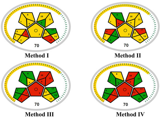 This pictogram evolution enables the GAPI tool to give an overall assessment of the greenness of analytical methods, instead of just evaluating each step separately. It also allows for more accurate and objective comparison between methods. Figure 1 shows four different methods assessed using the presented MoGAPI tool. The four methods exhibited a total score of 70, although each method has different green characteristics. Comparing these methods without a total score assigned to each method, depending on the entire analytical process, is not easy. For example, Method I has moderate greenness, as indicated by the multiple yellow sections. However, it is hard to compare Method I with Method II, which has more green sections, but at the same time, it has more red sections. This problem is more pronounced with Method III and Method IV. The proposed and developed evolution in the currently used GAPI scale not only allows comparison between these methods but also helps classify methods into excellent green (≥75), acceptable green (50–74), and inadequately green (<50), similar to the score used in the analytical Eco-Scale. The total score in this MoGAPI assessment appears on the chart, and the color of the scale around the pentagrams indicates the overall evaluation of the method. The software used to calculate the score and to generate the MoGAPI assessment is freely available (open source) at bit.ly/MoGAPI. It should be noted that a similar modification has been recently applied to ComplexGAPI to assign a total score, and an overall evaluation of analytical methods with pre-analytical procedures [21].