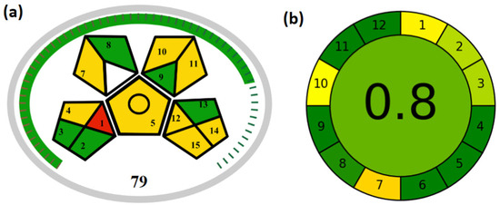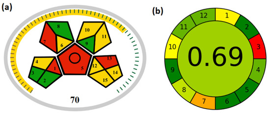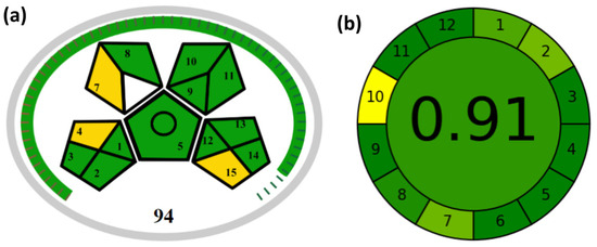 In the first application, a mixture of chloroform and dodecanol (30:70, v:v) was used for the dispersive liquid–liquid microextraction of four antiviral agents in environmental water, before analysis by HPLC-UV [22]. The stationary phase was a typical Hypersil ODS C18 column and the mobile phase consisted of ACN:phosphate buffer (50 mM, pH 6) (50:50, v:v). The samples were collected offline, with no preservation nor transportation required, stored under normal conditions, and microextracted using non-green solvent, without any additional treatment, with less than 10 mL of toxic solvent. The energy required for the instrument is ≤1.5 kWh per sample, with hermetic sealing and 1–10 mL waste per sample. As shown in Figure 2a, the total score is 70, which renders the method intermediate in greenness. The score was compared with the calculated greenness of the same method using the AGREE metric. As shown in Figure 2b, comparable results were obtained. It is worth mentioning that the two metrics do not have to give the same exact scores, but they should lead to the same conclusions.