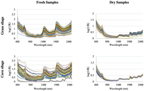 Figure 5 shows the spectra of grass silage and corn silage for both dry and therefore homogenized samples, and for fresh non-homogenized samples, from a study of 400 grass silage samples and 400 corn silage samples [46]. The spectra are clearly very similar and are dominated by the water spectrum, with overtone bands of OH bonds at 1450 nm and a combination band at 1950 nm, which corresponds to the moisture content [47,48]. It is also possible to see the most intense peaks in fresh and therefore non-homogenized samples [49].