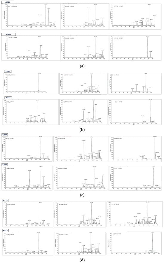 The plant metabolites Pip, NHP, and SA were analyzed across all treatments. These metabolites were detected in the target-selected ion monitoring mode by measuring the accurate mass of monoisotopic ions. The data analysis utilized m/z values, and retention times differed among the three metabolites. The objective was to investigate the relationship between these metabolites and tomato plants. To achieve this, eight treatment samples from two different plant cultivars were analyzed using LC-MS. The results revealed significant variations in the Pip, NHP, and SA peak areas between the two cultivars. Forty-eight hours after spraying, G5T3 plants exhibited the highest accumulation of Pip, with a maximum peak area of 31 × 105 mAU. Conversely, the lowest accumulation of Pip’s precursor, NHP, was also observed in G5T3, with a peak area of 0.12 × 105 mAU. The salicylic acid levels were highest in G5T4, with a peak area of 7 × 105 mAU, while the lowest levels were recorded in G5T1 (control), with a peak area of approximately 4 × 104 mAU (Figure 1a–d).