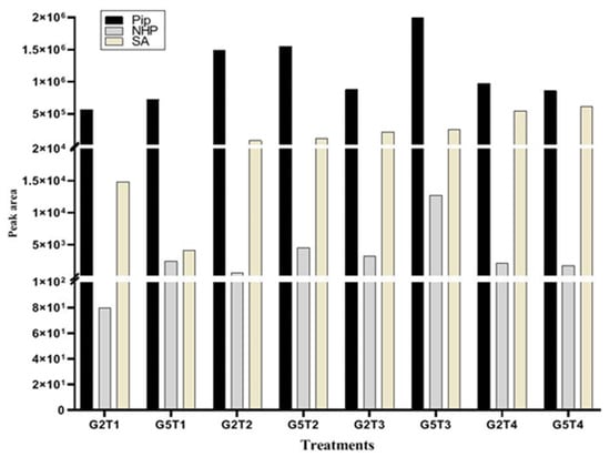 The Pip-triggered elevation confers tolerance to bacterial pathogens, with the marked potentiation of SA production. SA accumulation was higher at basal levels compared to NHP. In G5T1 (4.1 × 102 mAU), SA levels were comparatively lower than in G2T1 (1.4 × 103 mAU). The highest SA accumulation was observed in G5T4 (6.1 × 105 mAU) compared to G2T4 (5.4 × 105 mAU). However, SA levels were nearly similar in T3 treatments, where G2T3 accumulated 2.1 × 104 mAU and G5T3 accumulated 2.5 × 104 mAU, as shown in Figure 2. Enhanced SA production was evident in T2 and T3 treatments, particularly following pathogen infection (Table 2 and Table 3).