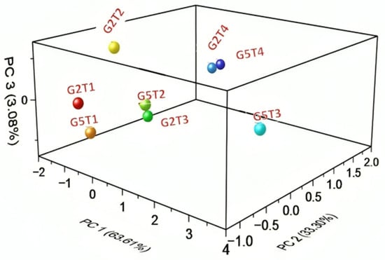 Based on LC-MS results, a PCA score plot (Figure 3) was generated to show that the clustering of plant metabolites varies among the treatments. Low levels of plant metabolites can be considered indicative of no infection and lower plant defense mechanisms. The PCA plot shows a clear variation between G2T1 and the cluster comprising G5T1, G5T2, and G2T2, while G2T3 and G5T3 are distinct from this cluster. However, G2T4 and G5T4 were clustered together. The proximity of T3 is noteworthy, as these treatments differ in variety. A second cluster of G2T4 and G5T4 was also observed.