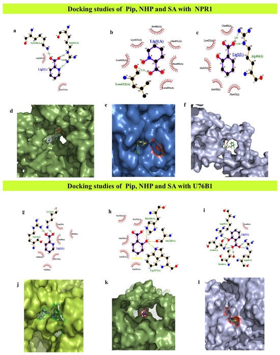 Three-dimensional models of the interactions between Pip, NHP, and SA with NPR1 (a–c) are presented, where Pip, NHP, and SA are shown as surfaces, while the docked NPR1 structures are displayed as sticks (d–f). Similarly, 3D models of the interactions between Pip, NHP, and SA with U76B1 (g–l) are shown, with Pip, NHP, and SA represented as surfaces and the docked U76B1 structures depicted as sticks.