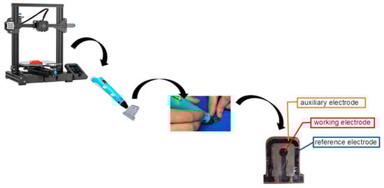 The 3D-printed sensor (counter, reference, and working electrode) was manufactured by hand using CB-PLA filament extruded from a Top Tean Meg 3D printing pen (235 °C, low extrusion ratio). The low extrusion rate optimized material deposition, mitigating bubble formation and ensuring the complete filling of the support structure. After cooling, the sensors were mechanically polished with 320-grit wet sandpaper to obtain smooth and uniform surfaces, standardizing the geometric area and improving electrical conductivity. The printing process is illustrated in Figure 1.