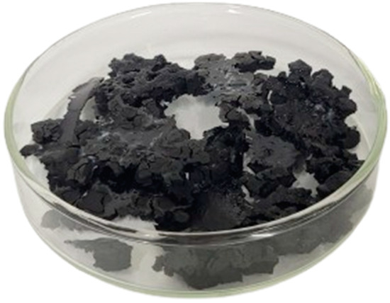 To optimize the incorporation of CB and reduce the solubilization time, a 3:1 mixture of acetic acid and dichloroethane was proposed. The ratio was defined by using the geometric method on the Teas graph (Figure S1), which positioned the PLA in a line between the two solvents, resulting in a ratio of 3:1. This mixture promoted the complete solubilization of PLA in less than 1 h. The incorporation of CB into the PLA was conducted under reflux at 70 °C in an oil bath, under constant agitation for total homogenization. The resulting solution was poured into a glass dish and dried at 50 °C in an oven for 12 h to allow for the complete evaporation of the solvent and for the formation of agglomerates (Figure 2). The dried material was cut into small fragments to optimize extrusion and ensure the homogeneity of the filament.