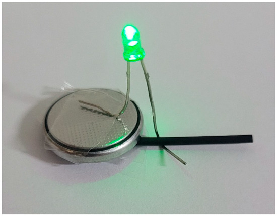 The filament extrusion process was carried out in a Filmaq3D CV Extruder (Filmaq 3D, Curitiba, Brazil) at 170 °C. At this temperature, it was possible to obtain a more homogeneous filament, with an approximate thickness of 1.75 mm, while maintaining the characteristic of polymer flexibility necessary for an efficient printing process. At temperatures above 170 °C, the extruded filament has a more malleable consistency, generating a filament with an irregular thickness. At lower temperatures, it was not possible to extrude the material, due to the clogging of the extrusion nozzle. After obtaining the filaments, a simple qualitative study was carried out to evaluate electrical conductivity. For this, a system was assembled by connecting the filament to a 3 V battery and an LED, and it was possible to observe the emission of light, indicating the passage of electric current (Figure 3).