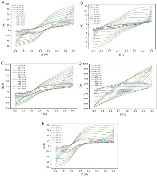Cyclic voltammograms, varying the scan rate from 10 mV s−1 to 600 mV s−1: (A) 3D sensor; (B) 3D-SE; (C) 3D-SAcid; (D) 3D-SBasic; (E) 3D-SSolvent., in the presence of 5.00 mmol L−1 of [Fe(CN)6]4−/3− and 0.10 mol L−1 KCl.