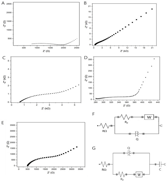 Nyquist diagram for (A) 3D sensor, (B) 3D-SE, (C) 3D-SAcid, (D) 3D-SBasic, and (E) 3D-SSolvent for a system containing an equimolar mixture of 5.00 mmol L−1 [Fe(CN)6]4−/3− in 0.10 mol L−1 KCl. (F) Randles equivalent circuit for 3D sensor, 3D-SE, 3D-SAcid, and 3D-SSolvent. (G) Equivalent circuit for 3D-SBasic.
