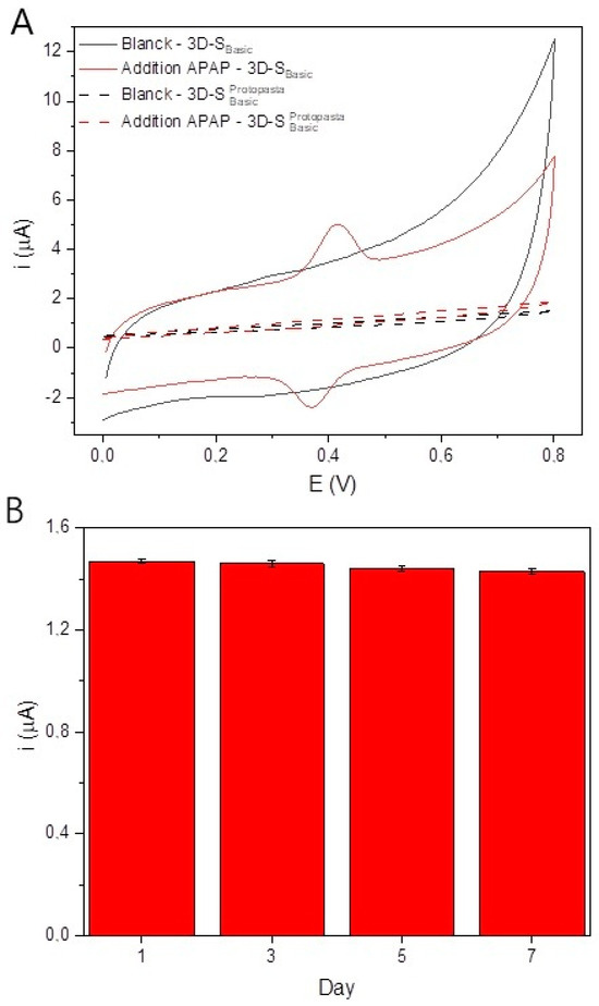 (A) Cyclic voltammograms for 3D-Sbasic (solid line) and 3D-SbasicProtopasta (dashed line) in the presence and absence of APAP and (B) stability study for the 3D-basic. Experimental conditions: 0.10 mol L−1 phosphate buffer, pH 7.00, 10.0 μmol L−1 APAP.