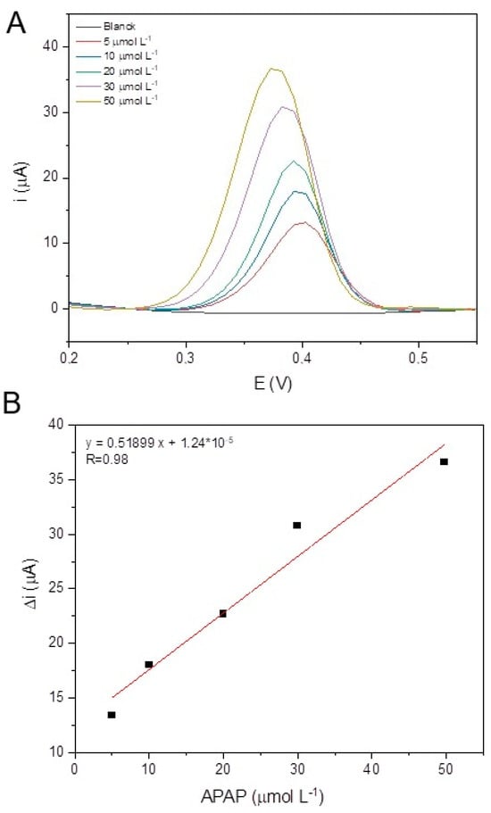 The electrochemical performance of the proposed sensor was evaluated according to its ability to determine APAP in 0.10 mol L−1 phosphate buffer, pH 7.0, for different APAP concentrations (5.0–50.0 μmol L−1) using the differential pulse voltammetry (DPV) technique. The results are illustrated in Figure 7A. Through the voltammograms, it is possible to observe a gradual increase in the peak current, indicating that the sensor can detect different concentrations of APAP. The anodic peak current was correlated as a function of the APAP concentration to obtain an analytical curve (Figure 7B).