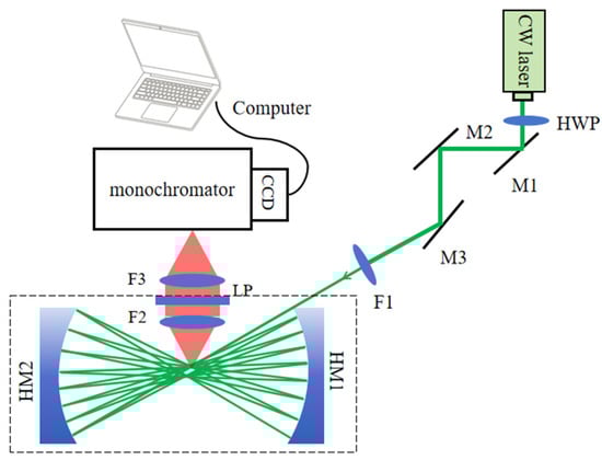Figure 1 shows a schematic diagram of the multi-pass enhanced Raman spectroscopy system. It primarily consists of four components: a laser, a multi-pass cavity, a signal collection part, and a signal detection part. Lasers are chosen as the excitation light source due to their advantages of high monochromaticity and intensity. Since the intensity of Raman scattering signals is inversely proportional to the fourth power of the wavelength and directly proportional to the excitation light power, a laser with a shorter wavelength and higher energy is used in this experiment to enhance the Raman signal intensity. A semiconductor 532 nm laser (MGL-S-532–300mW, CNI, Changchun, China) was adopted in the experiment setup. The excitation light first passes through a half-wave plate, changing the laser’s polarization from horizontal to vertical, as the strongest Raman signal can be collected when the polarization direction is perpendicular to the Raman scattering collection direction [26]. The polarized light is then focused on the center of the multi-pass cavity by lens F1. Given that the plano-concave mirrors used in the experiment have a curvature radius of 100 mm, a lens with a larger focal length than the mirror’s curvature radius (F1 = 200 mm) is chosen to avoid affecting the laser’s reflection within the cavity. The multi-pass cavity has a simple structure, typically consisting of two plano-concave mirrors. The laser enters the cavity from the side at a certain angle and undergoes multiple reflections back and forth between the front and rear mirrors along different paths. Each reflection of the laser passes nearly through the same point within the multi-pass cavity, where interference occurs, enhancing the laser power and thereby increasing the Raman signal. The distance between the two plano-concave one-inch mirrors is 200 mm. The mirror reflectivity is greater than 99%, and the focal length of 50 mm. The light signal focused at the cavity center is collected by a telescope system consisting of two one-inch lenses (F2 = 30 mm, F3 = 100 mm), with a long-pass filter (Semrock BLP01-532R-25, Semrock, Rochester, NY, USA) placed between the lenses to eliminate the influence of excitation light and Rayleigh scattering on the signal. The collected light directly focuses on the monochromator’s entrance slit; then, it is dispersed by the grating and captured by a CCD detector. The monochromator (Andor SR-303i-B, Andor Technology, Belfast, Ireland) employs a grating with a blaze wavelength of 500 nm and 600 L/mm rulings with a camera (Andor DH334T-18U-E3, Andor Technology, Belfast, Ireland) featuring a CCD matrix size of 1024 × 1024. The CCD camera was cooled to −25 °C to minimize the impact of dark current on the signal, and all experiments were carried out in a dark environment.
