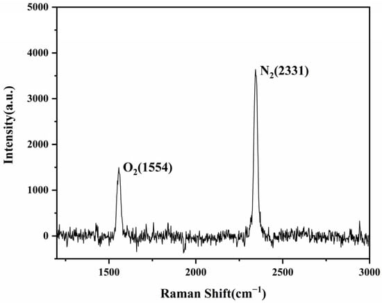 The multi-pass enhanced Raman spectroscopy gas detection setup constructed in this study was first used to detect the Raman signals of ambient air. The detection was performed with a 90° Raman scattering collection angle, a laser power of 300 mW, an integration time of 200 s, an entrance slit width of 100 μm, and a laboratory temperature of 25 °C. As shown in Figure 2, the Raman spectra of nitrogen (2331 cm−1) and oxygen (1554 cm−1) in the air are presented. The nitrogen content in the air is 78%, and the oxygen content is 21%. The presence of these two characteristic Raman peaks is clearly observed. In greenhouse gas monitoring research, all measurements are conducted against the background of the atmospheric environment. Nitrogen and oxygen, due to their stable concentrations and distinct Raman characteristic peaks, serve as ideal references for correcting system fluctuations. This study validates the universality of the multi-pass cell through the detection of conventional gases, laying the foundation for subsequent measurements of the greenhouse gas carbon dioxide. More importantly, this technology enables the simultaneous detection of multiple gas components using single-wavelength excitation, demonstrating its unique advantages in analyzing complex atmospheric compositions.