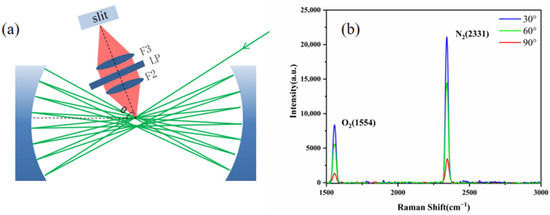 According to Equation (1), the Raman scattering signal intensity exhibits angular dependence. Therefore, this section investigates and analyzes the influence of signal collection angles on Raman scattering signals. Figure 3 shows Raman signal intensity characterization at three collection geometries. Figure 3a shows a schematic diagram of the Raman scattering collection geometry, where the angle between the optical axis direction and the collection direction is θ. Through the systematic characterization of the Raman scattering collection geometries (30°, 60°, 90°), we observed a significant angular dependence on signal intensity (Figure 3b). It was found that as the collection geometry θ decreases, the Raman scattering intensity gradually increases, with the lowest intensity at 90° collection and the strongest at 30° collection. The 30°collection configuration demonstrated a 7-fold enhancement compared to conventional 90° backscattering geometry. This critical finding establishes that oblique angle collection effectively amplifies the detection of weak Raman signals, providing a key design principle for sensitive gas-phase Raman spectroscopy systems. Therefore, a 30° collection geometry was chosen for this study.