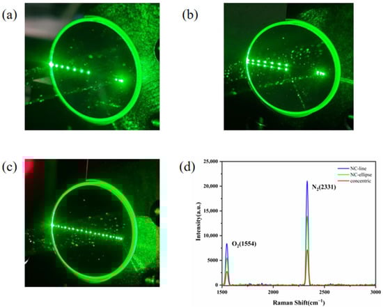 The intensity of Raman scattering signals is not only related to the signal collection geometry but also to the reflection pattern of the excitation laser. During the debugging process, it was found that changing the distance between the cavity mirrors or the angle between them forms different reflection patterns. Three distinct multi-pass cavity configurations were evaluated (Figure 4a–c), which, respectively, represent the near-concentric linear type, near-concentric elliptical type, and concentric linear type reflection patterns. The near-concentric linear configuration exhibited superior signal enhancement, achieving nitrogen signal intensities exceeding 20,000 counts—3–5 times greater than alternative configurations (Figure 4d). This enhancement mechanism stems from constructive interference effects at the common focal region, where multi-pass reflections create a localized high-intensity excitation zone. Notably, our experimental validation revealed that path-length optimization through cavity alignment plays a more significant role than the total reflection count. Therefore, the near-concentric linear type reflection pattern was chosen for the measurements.