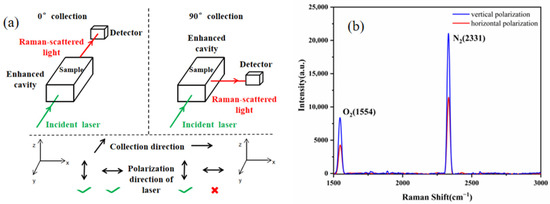 Laser polarization characterization. (a) Collection direction of Raman-scattered light; (b) Raman spectra.