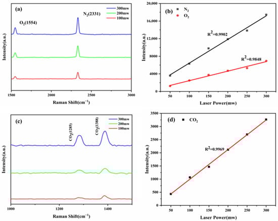 Laser power linearity characterization. (a) Raman spectra of nitrogen and oxygen; (b) variation of nitrogen and oxygen peak intensity with laser power; (c) Raman spectra of carbon dioxide; (d) variation of carbon dioxide peak intensity with laser power.