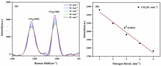 Based on the constructed multi-pass enhanced Raman spectroscopy setup, this paper investigates the Raman scattering intensity of carbon dioxide at various concentrations. Different concentrations of carbon dioxide gas were prepared by mixing with nitrogen (99%). The flow rate of carbon dioxide was regulated at 5 L·min−1 using a float flow meter, and the Raman signal intensity of carbon dioxide was studied at nitrogen flow rates of 1, 2, 3, 4, and 5 L·min−1. Figure 7a presents the Raman spectra of carbon dioxide at different concentrations, with two primary Raman characteristic peaks observed at 1285 cm−1 and 1388 cm−1. The intensity of these Raman characteristic peaks of carbon dioxide as a function of concentration is illustrated in Figure 7b. It is evident that the height of the characteristic Raman peaks of carbon dioxide varies linearly with concentration. This linear dynamic response confirms our system’s potential for ppm-level quantitative analysis with proper calibration protocols.