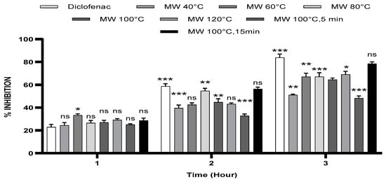 Percentage of inhibition inflammation of MW extracts in rats with carrageenan-induced hind paw edema (values presented as means ± SD (n = 3): ns: not significant difference; * p < 0.05 ** p < 0.01, and *** p < 0.001 considered significant when compared with diclofenac.