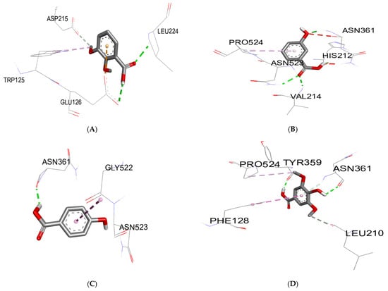 Two-dimensional detailed binding sites of each ligand into the receptor [PDB ID: 3LN0]. (A): 2,3-dimethoxybenzoic acid; (B): 3-hydroxybenzoic acid; (C): 4-hydrobenzoic acid; (D): syringic acid; (E): gallic acid; (F): benzoic acid; (G): catechin; (H): chlorogenic acid; (I): epicatechin; (J): isovanillin; (K): naringin; (L): o-coumaric acid; (M): p-coumaric acid; (N): quercetin; (O): rutin; (P): sinapinic acid; (Q): t-ferulic acid; (R): vanillic acid; (S): diclofenac.
