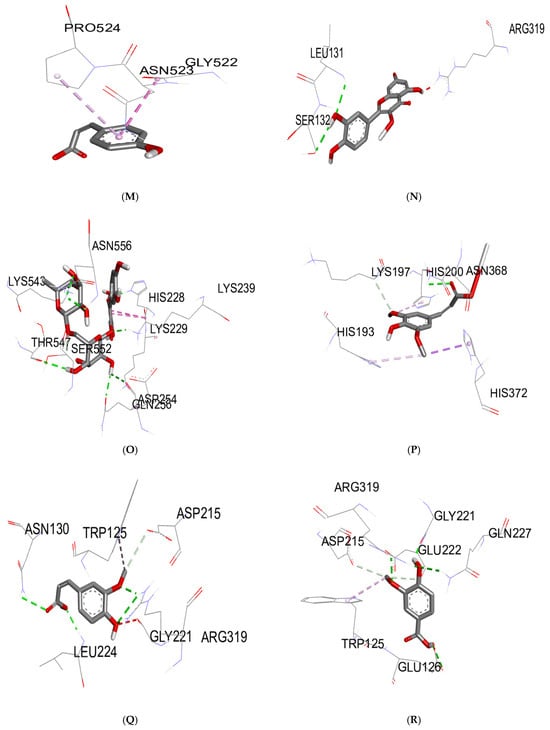 The 3D detailed binding sites of each ligand into the receptor [PDB ID: 3LN0]. (A): 2,3-dimethoxybenzoic acid; (B): 3-hydroxybenzoic acid; (C): 4-hydrobenzoic acid; (D): syringic acid; (E): gallic acid; (F): benzoic acid; (G): catechin; (H): chlorogenic acid; (I): epicatechin; (J): isovanillin; (K): naringin; (L): o-coumaric acid; (M): p-coumaric acid; (N): quercetin; (O): rutin; (P): sinapinic acid; (Q): t-ferulic acid; (R): vanillic acid; (S): dichlofenac.