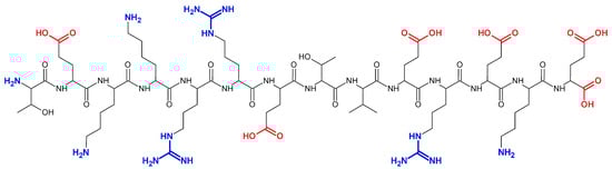 The subject is a tetradecapeptide HEP-1 consisting of 14 consecutive amino acids, threonyl-glutamyl-lysyl-lysyl-arginyl-arginyl-glutamayl-threonyl-valyl-glutamyl-arginyl-glutamyl-lysyl-glutamate (Figure 1), which are supposed to have immunomodulator and antiviral effects [30]. The mechanism of action may be based on altering the spectrum of synthesized interferons (IFNs) and cytokines [30]. A number of studies with limited patient sample sizes have reported positive effects of HEP-1 on the body’s immune response and overall medical state in a number of diseases, including decompensated caries, Hepatitis C, Human Immunodeficiency Virus (HIV), and Post-Acute Sequelae of Coronavirus disease (PASC) [30,31,32].