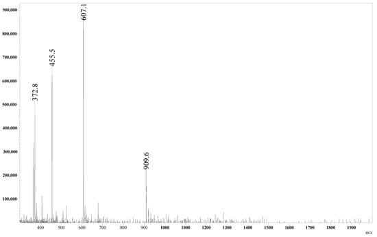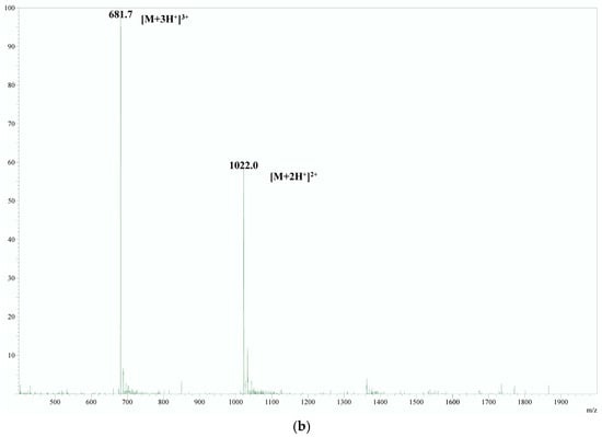 Based on the calculated monomolecular mass of HEP-1, which is 1817.0 Da [33], we predicted the m/z values for single- and multicharged quasimolecular ions that can be detected in the mass spectrum of the total ion current during electrospray ionization in the positive mode (Table 1). The computed values matched the experimental values (Figure 2), but there were some deviations. These can be explained by the limited resolution of the detector. No single charged ions were detected due to the seven basic amino acid residues of HEP-1, which favor multicharged cations. According to Nadler et al. [34], the charge state of ionized peptides by electrospray increases with an additional basic amino acid independently of the type of basic residue. This can be beneficial because, according to Dongre et al. [19], multi-protonated peptides fragment more easily than the single-protonated forms of the same peptides, and a multicharged form decreases the number of degrees of freedom, which lowers the energy input into the fragment.