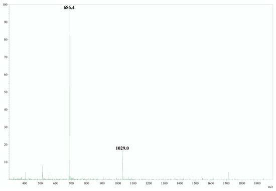Derivatization of HEP-1 in blood plasma using methanol as a precipitant yielded the strongest signal intensity. However, when we analyzed samples with different concentrations, we observed no linearity in the results obtained for the target 4-propionylated derivative. Therefore, we assumed a side reaction would occur and analyzed the sample in total ion current. The analysis revealed the presence of a substance with a molecular mass of approximately 2056 Da (m/z 514.9, 686.4, 1029.0). Mass spectrum is presented in Figure 4. The substance had a later retention time than the target compound (2.55 min for the byproduct and 2.42 min for the target product). We supposed that elevated temperatures within an acidic water-methanol solution would induce a side reaction with carboxylic groups of HEP-1, and the resulting product would be a methyl ester. Two mechanisms for the side reaction may be proposed: the formation of mixed anhydrides [53,54] and transesterification [55]. In the first case, propionic anhydride initially interacts with the carboxyl groups of the peptide, and a mixed anhydride is obtained, which is then destroyed by methanol with the formation of methyl esters. This hypothesis is strengthened by the observation that the mass spectrum showed correspondence with a calculated mass spectrum of the methylated derivative of 4-propionylated HEP-1.