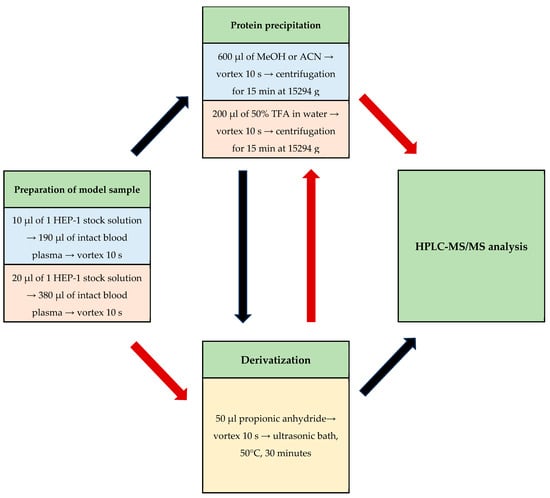 Blood plasma sample preparation. Black arrows show the sequence of stages with derivatization after protein precipitation, red arrows—derivatization before protein precipitation. The stages in the case of protein precipitation with methanol or acetonitrile are indicated by a bluish background, and for a 50% TFA solution in water—by a reddish background.