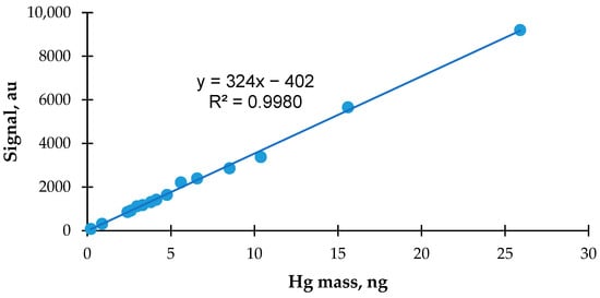 A plot of Hg standard signals against absorbance was drawn to check whether the instrument is well optimized (Figure 1). The calibration curve with a correlation coefficient of approximately 1 was obtained, thus confirming a well-optimized instrument. Therefore, it can be concluded that sample matrices did not have any effect on the release of Hg and can be used for the creation of a single universal calibration curve for the determination of mercury. Such data is stored in the PC memory and used for the automatic calculation of Hg concentration during analysis.