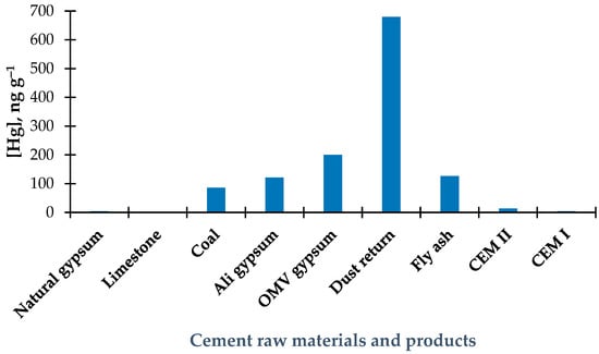 Cement production is the second largest source of anthropogenic Hg emissions in the environment worldwide, with Europe accounting for 11% of global anthropogenic Hg emissions []. Hg enters the cement manufacturing process as a trace element through raw materials (limestone, slag, and coal) that are utilized during cement production. Hg concentration in natural raw materials varies from deposit to deposit, depending on the origin and source [,,,]. A typical cement manufacturing process involves three fundamental stages, viz., preparation of feedstocks, clinker production, and cement production.