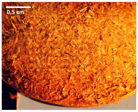 Example of a 4 cm diameter barley forage pressed pellet. The 100 circles superimposed on the picture represent the template used by the Modular system for the placement of laser shots.