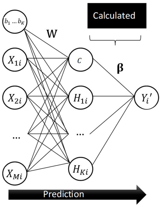 The ELM algorithm, developed by Huang [], enables rapid training of single-layer feedforward neural networks. Unlike traditional neural networks that require iterative weight adjustment (e.g., via backpropagation), ELM randomly assigns input weights and biases and computes output weights analytically. This process allows for exceptionally fast training while preserving generalization capability.