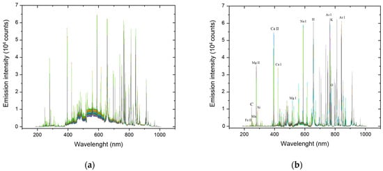 Figure 4 presents the LIBS spectra obtained from 61 barley forage samples using the Modular spectrometer. Each spectrum is an average of approximately 100 individual spectra, with each location representing the average of five consecutive laser shots. To ensure data reliability, outlier spectra were identified and removed using a PCA-based filtering approach. Specifically, spectra falling far outside the main cluster in the PCA score plot were excluded, typically fewer than six per sample, before averaging the remaining spectra. This preprocessing step effectively removed spectra exhibiting significant deviations, likely due to local inhomogeneities or acquisition artifacts.