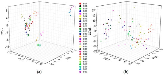 PCA was employed to evaluate the consistency of LIBS measurements within each sample and to assess the chemical variability between samples. For each of the 61 samples, 100 spectra were randomly divided into three subgroups of equal size. The spectra within each subgroup were averaged to generate three representative spectra per sample, thereby enabling simultaneous assessment of both intra-sample reproducibility and inter-sample differentiation. PCA was then performed on the resulting set of 183 spectra (3 × 61). To aid interpretation, Figure 5 presents the PCA score plots for a representative subset of 30 samples, comparing the results obtained with both the Modular and Echelle LIBS instruments.