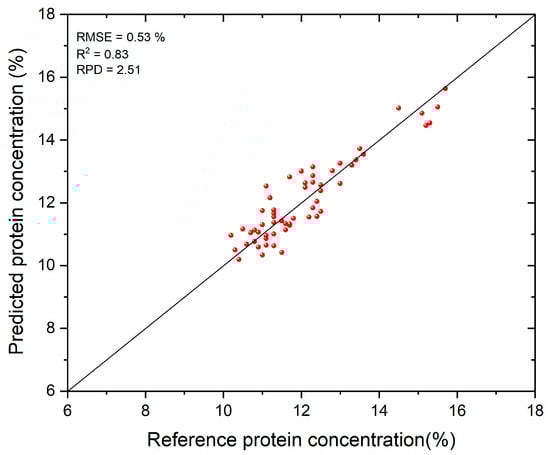 To evaluate the practical robustness and operational viability of the ELM-Modular calibration model, we performed predictions using alternative spectral averages derived from only 50 randomly selected spectra per sample, half the number used during model training. Given the inherent heterogeneity of the ground barley samples, these reduced spectral subsets provide a more stringent and realistic test of the model’s performance under suboptimal acquisition conditions. Remarkably, as shown in Figure 6, the model maintained strong predictive accuracy despite this challenging scenario, with an RMSE of 0.53%, an of 0.83, and an RPD of 2.51. These results underscore the model’s robustness and suggest its suitability for deployment in field or industrial settings where spectral acquisition may be constrained by time, resources, or operational variability. For comparison, PLS gives an RMSE of 0.80%, an of 0.64, and an RPD of 1.80.