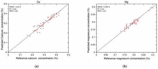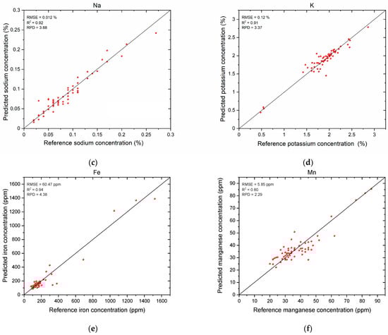 Predicted vs. measured nutrient concentrations ELM models for 50 randomly selected spectra for each sample: (a) Ca; (b) Mg; (c) Na; (d) K; (e) Fe; (f) Mn.