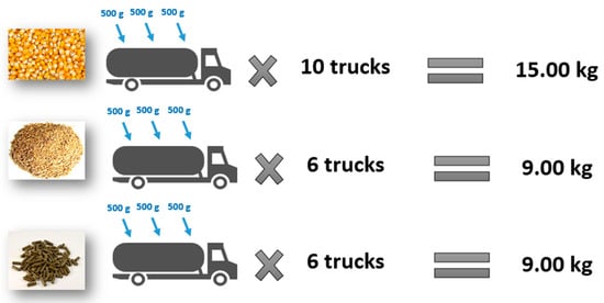 For each batch, sampling was carried out using three probe collections of 500 g each, resulting in a total of 1.5 kg per truck. For corn, this protocol was applied to 10 trucks, yielding a composite sample of 15 kg per corn batch. For soybean meal and sunflower meal, the total sampled quantity per batch was 9 kg for each raw material (Figure 1).