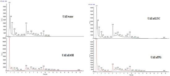 UHPLC chromatograms of extracts estimated from DAD signal at λmax = 300 nm. Abbreviation meanings: UAE/water—extract produced after UAE with distilled water; UAE/aEtOH—extract produced after UAE with aqueous 37% (v/v) ethanol; UAE/aGLYC—extract produced after UAE with aqueous 38% (v/v) glycerol; UAE/aPPG—extract produced after UAE with aqueous 38% (v/v) propylene glycol.
