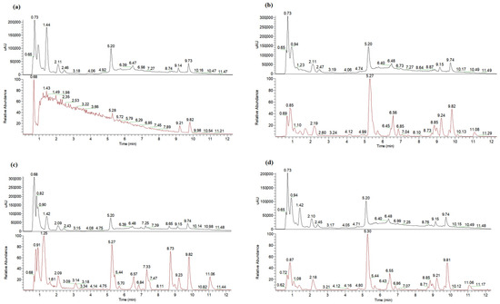 UHPLC-DAD and UHPLC-MS chromatograms ranked by base peaks for extracts produced after UAE with aqueous 38% (v/v) propylene glycol from waste apple dust pretreated with different NADESs: Honey (a), Reline (b), Oxaline (c) and Glyceline (d).