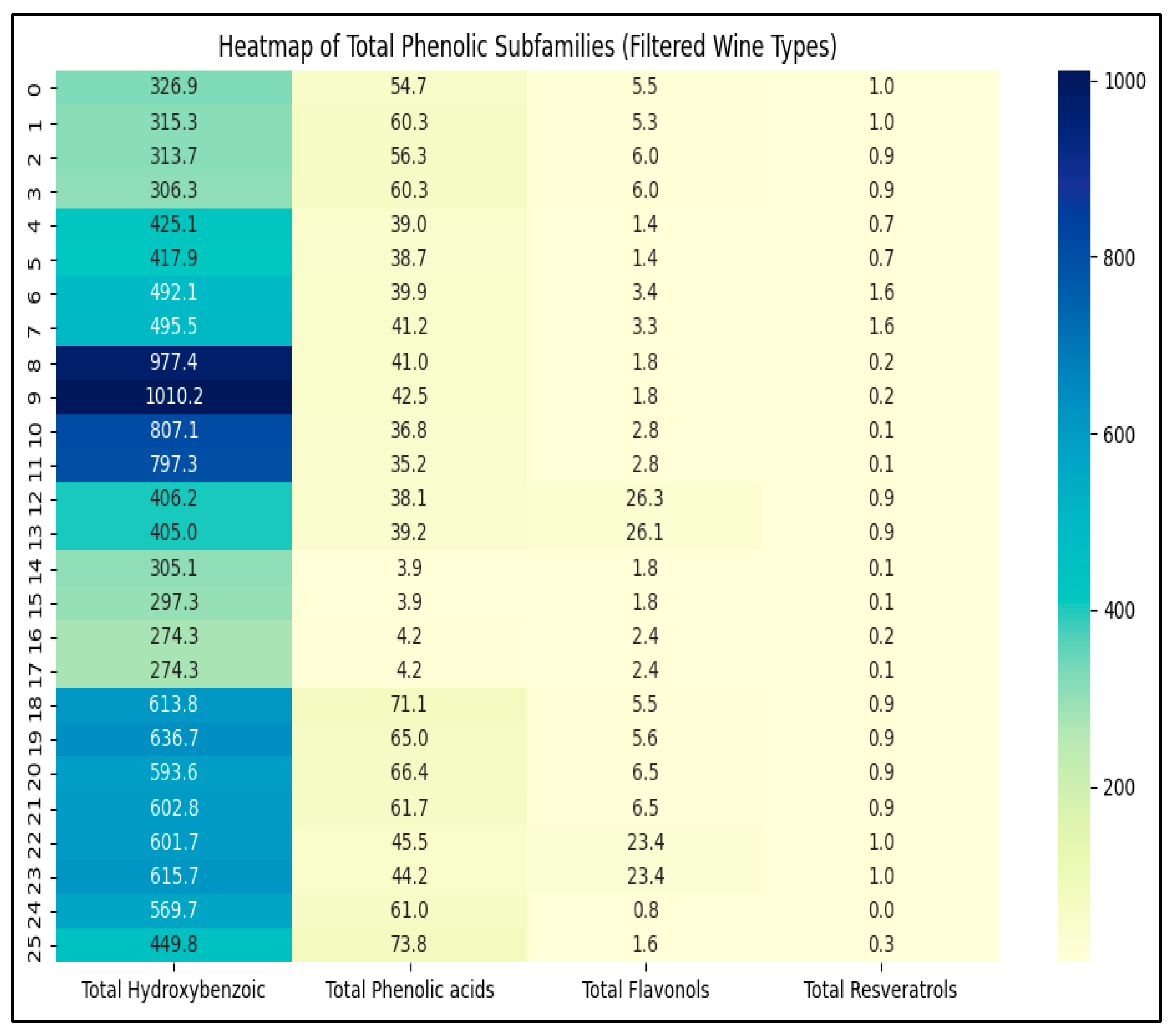 | Cerruje (AL) | 119 | wine dataset, 2017–2021 | Cerruja displayed moderate phenolic richness, possibly influenced by vintage and microclimate variations. |