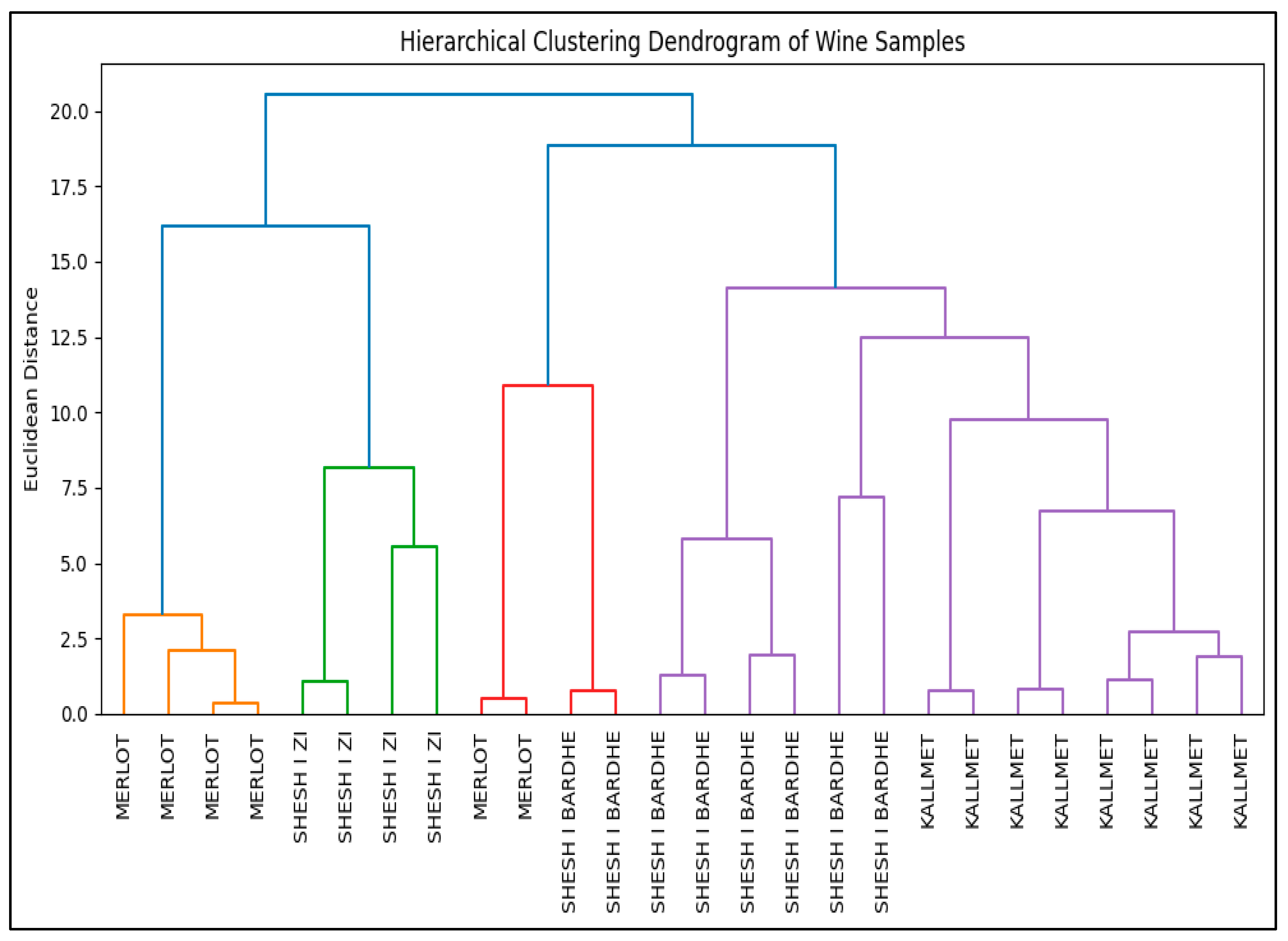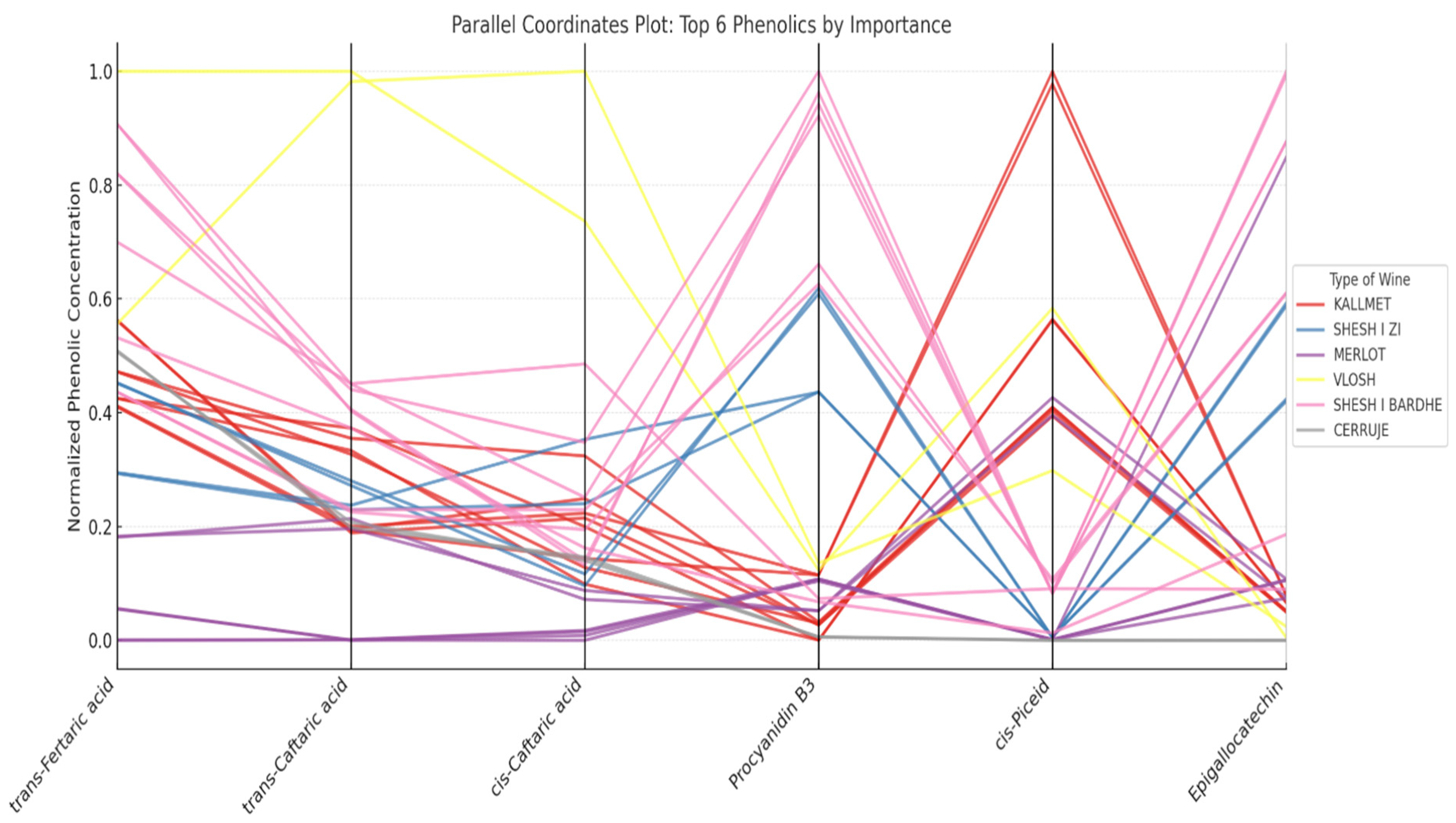| Vlosh (AL) | 358 | wine dataset, 2017–2021 | Vlosh, an autochthonous variety, demonstrated robust phenolic content, supporting its historic use in regional red blends. |